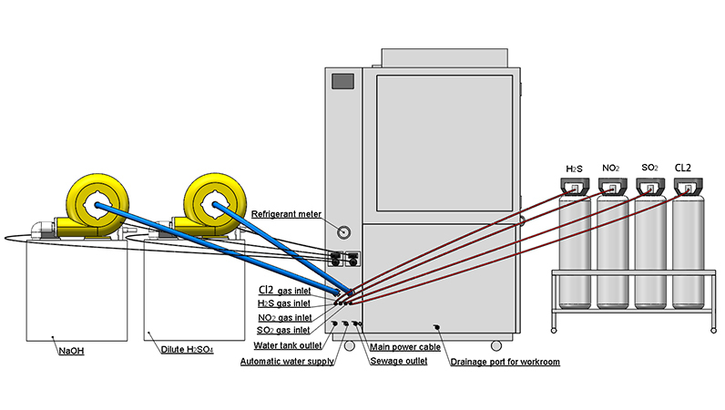 Buồng công nghiệp LIB kiểm soát chính xác hỗn hợp H2S, SO2, NO2 và CL2 ở nồng độ từ 10 ppb đến 500 ppb, đảm bảo sao chép chính xác bầu khí quyển ăn mòn. Bộ điều khiển lưu lượng Khối lượng (mfcs) duy trì tốc độ dòng chảy ổn định trong khoảng từ 0.5 đến 2.0 ml/phút mỗi khí, cho phép tiếp xúc nhất quán với tất cả các mẫu.