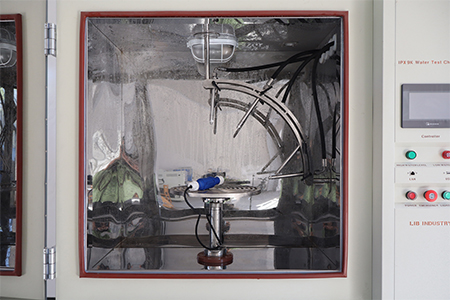 Trước khi thử nghiệm, mẫu vật được đặt trên bàn xoay có các lỗ vít M6 được thiết kế sẵn để cố định mẫu vật bằng vít. Khi thiết bị thử nghiệm IPX9K được khởi động, lưu lượng nước được điều khiển bằng đồng hồ đo áp suất và lưu lượng kế, một đầu nối nguồn chống thấm nước trên bàn xoay sẽ cấp điện cho mẫu thử.