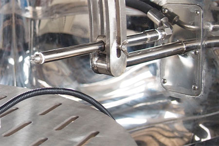 Thép không gỉ SUS304, buồng kín chống ăn mòn và đảm bảo độ bền dưới điều kiện phun áp suất cao liên tục. | Bốn vòi phun bằng thép không gỉ chính xác (đường kính Ø0,8 mm) được đặt ở các góc 0°, 30°, 60° và 90°, cung cấp tia nước với áp suất lên đến 80–100 bar và nhiệt độ 80 ℃. |